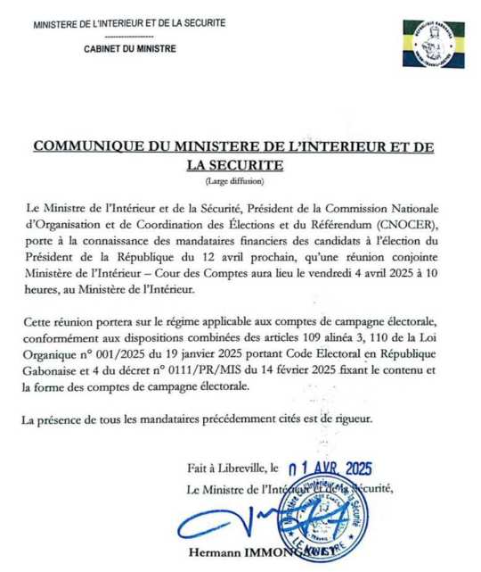 Libreville le 02 Avril 2025. La rédaction 066867376 Globe infos. Le Ministère de l’Intérieur et de la Sécurité annonce la tenue d’une réunion conjointe avec la Cour des Comptes le vendredi 4 avril 2025 à 10 heures au siège de cette institution. D’après le communiqué, cette rencontre réunira les mandataires financiers des candidats à l’élection présidentielle du 12 avril prochain afin d’examiner le cadre réglementaire applicable aux comptes de campagne électorale.