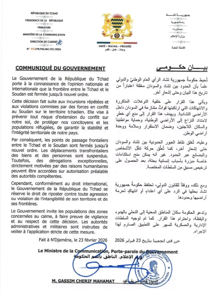 Le gouvernement tchadien a annoncé, dans un communiqué daté du 23 février 2026 et signé par le ministre de la Communication, la fermeture immédiate de la frontière entre le Tchad et le Soudan. Présentée comme une mesure de protection face aux « incursions répétées » et aux violences commises par les forces en conflit au Soudan sur le territoire tchadien, cette décision soulève de lourds enjeux sécuritaires, humanitaires et économiques pour le pays et les populations frontalières.