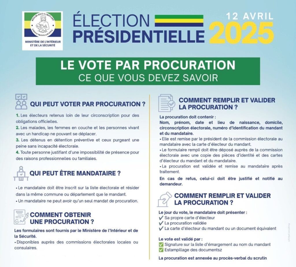 Libreville, 28 mars 2025. Dans une bannière conçue par les services du ministère de l’intérieur garant de l’organisation du scrutin du 12 avril prochain, l’opinion publique prend connaissance de tout ce qui concerne l’utilisation de la procuration pendant cet échéances électorales avenir.